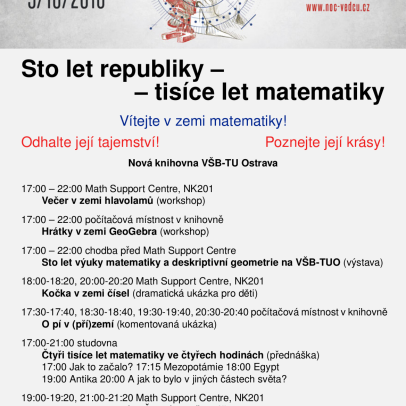 Tentokrát obsadili matematici FS a FAST tři stanoviště. V počítačové učebně nové knihovny si mohli návštěvníci vyzkoušet práci s GeoGebrou. Podle připraveného návodu si mohli vytvořit například počítačovou modelaci 3D sluneční soustavy nebo animaci slunečníku a 3D brýle si nakonec odnesli domů. V místnosti MSC si mohli návštěvníci potrápit hlavu našimi hlavolamy. Ti mladší se z dramatické ukázky dozvěděli o kouzlu nekonečna a jak seřadit všechny zlomky. Pro starší byla připravena přednáška o významných českých matematicích. A kdo věnoval matematice celé odpoledne, dozvěděl se, co se v matematice událo za posledních čtyři tisíce let.